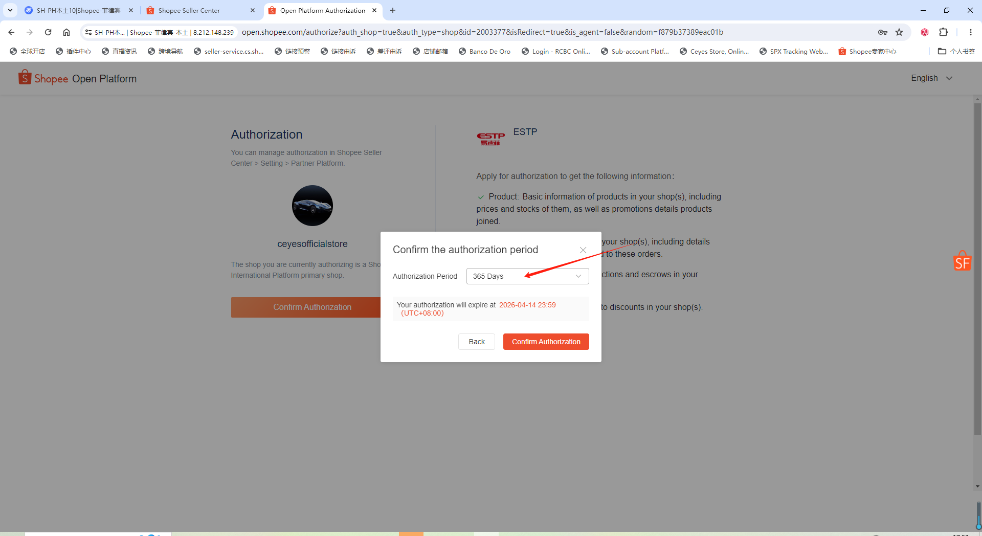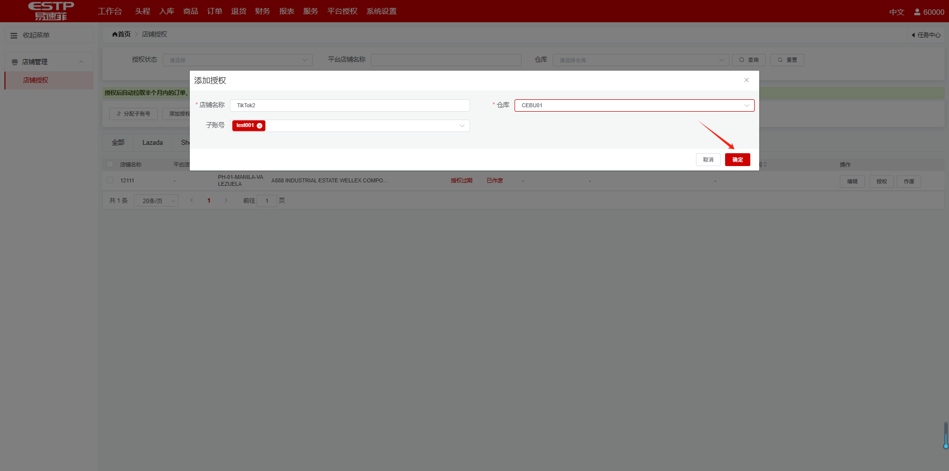 添加授权(授权过期的店铺点击列表操作栏中的授权按钮),填写配置信息,点击确定: