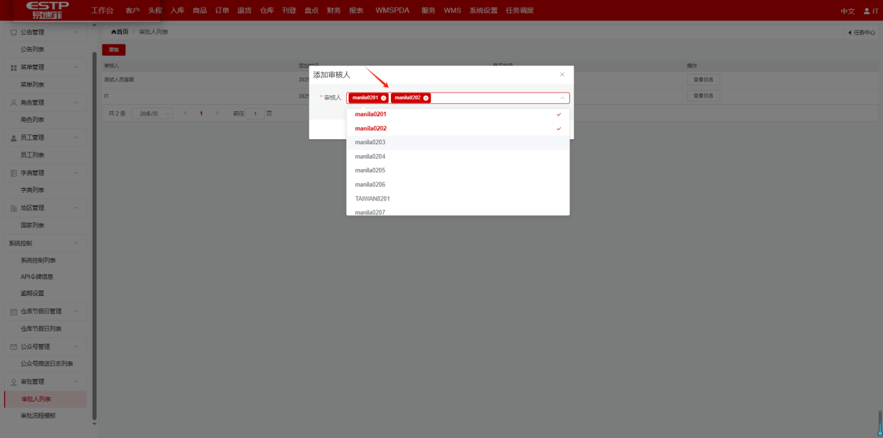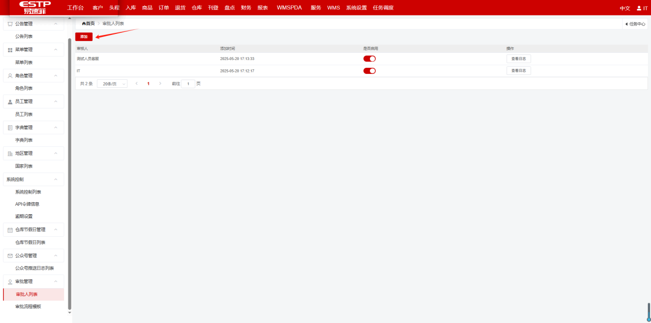 管理端-增值服务操作手册发表时间:2025-05-22 16:19 增值服务操作手册功能概述增值服务通道是供客户提交特殊业务申请(如库存转移、条码更换、产品包装等)的入口,管理端需要负责这些申请的审核并处理相关工作。操作步骤前置工作 在系统设置中选择审批人列表,进入页面后,点击添加: